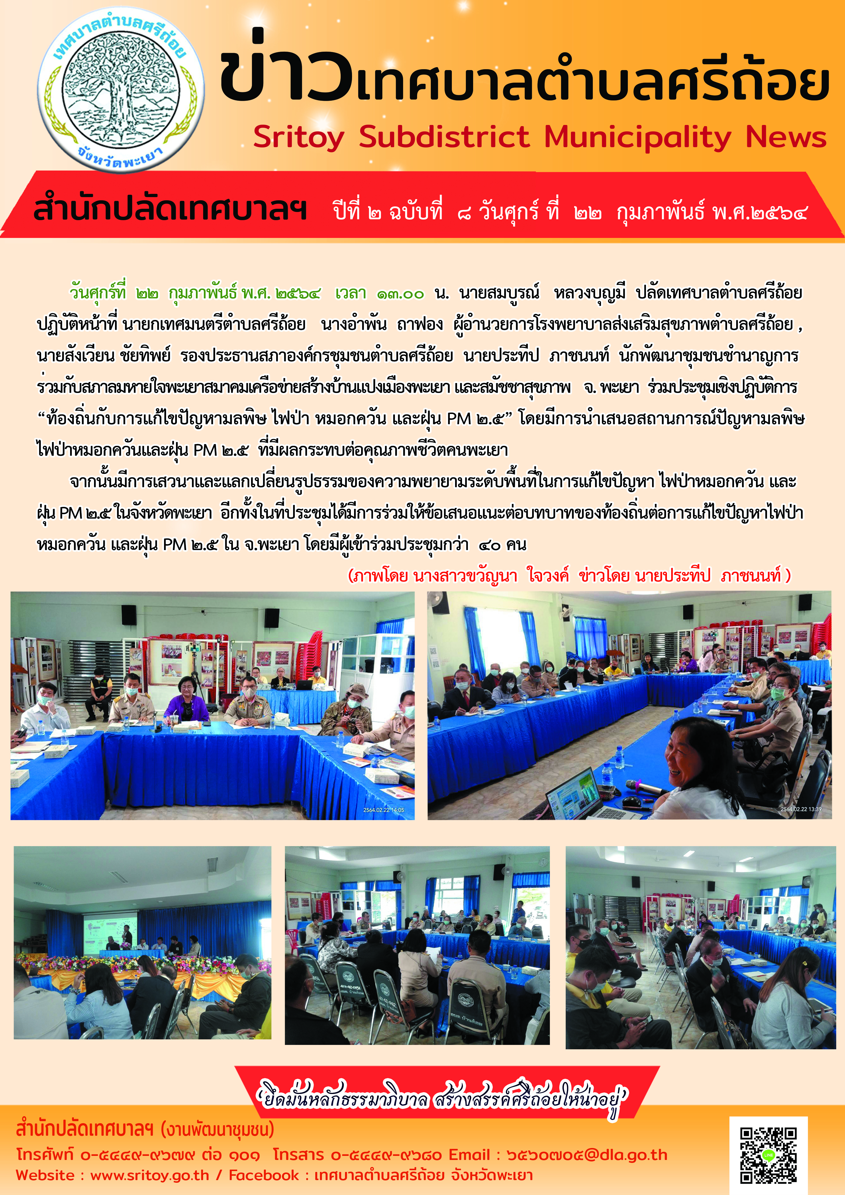 ข่าวประชาสัมพันธ์ เทศบาลตำบลศรีถ้อย สำนักปลัดเทศบาลฯ ปีที่ 2 ฉบับที่ 8 วันศุกร์ ที่ 22 กุมภาพันธ์ 2564 นายสมบูรณ์ หลวงบุญมี ปลัดเทศบาล