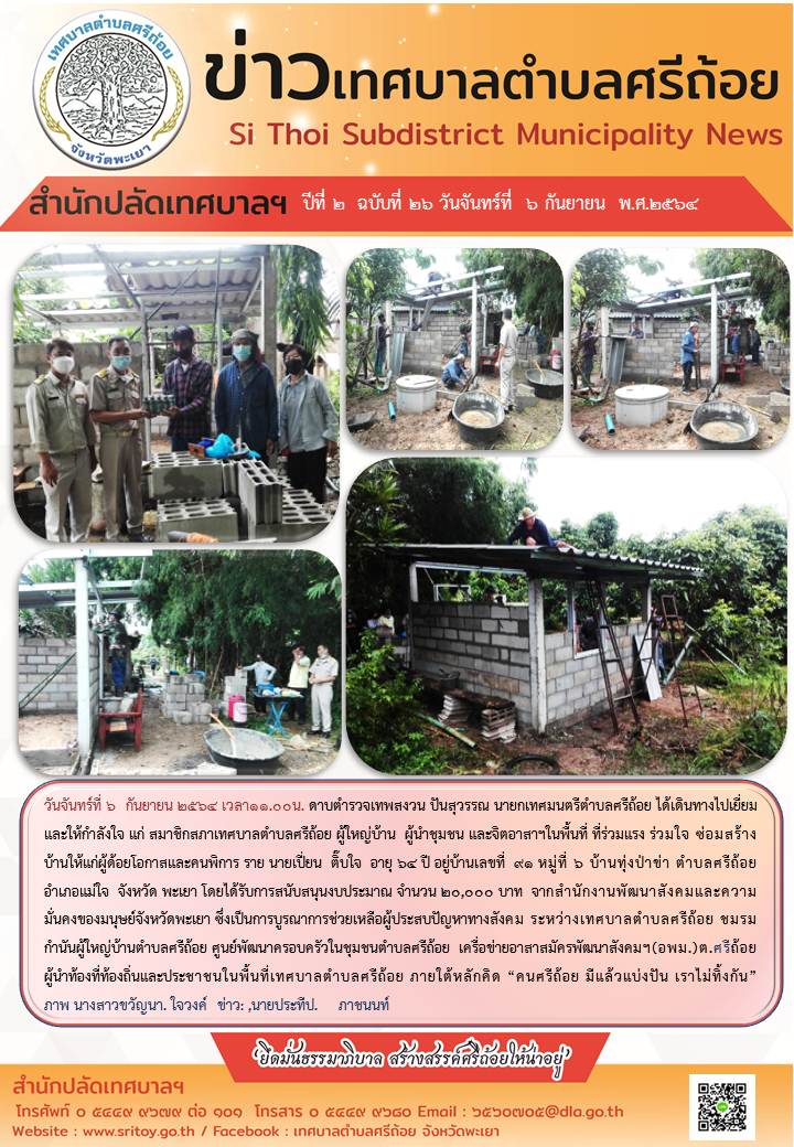ดาบตำรวจเทพสงวน ปันสุวรรณ นายกเทศมนตรีตำบลศรีถ้อย ได้เดินทางไปเยี่ยมและให้กำลังใจ แก่ สมาชิกสภาเทศบาลตำบลศรีถ้อย ผู้ใหญ่บ้าน ผู้นำชุมชน และจิตอาสาฯในพื้นที่ ที่ร่วมแรง ร่วมใจ ซ่อมสร้างบ้านให้แก่ผู้ด้อยโอกาสและคนพิการ