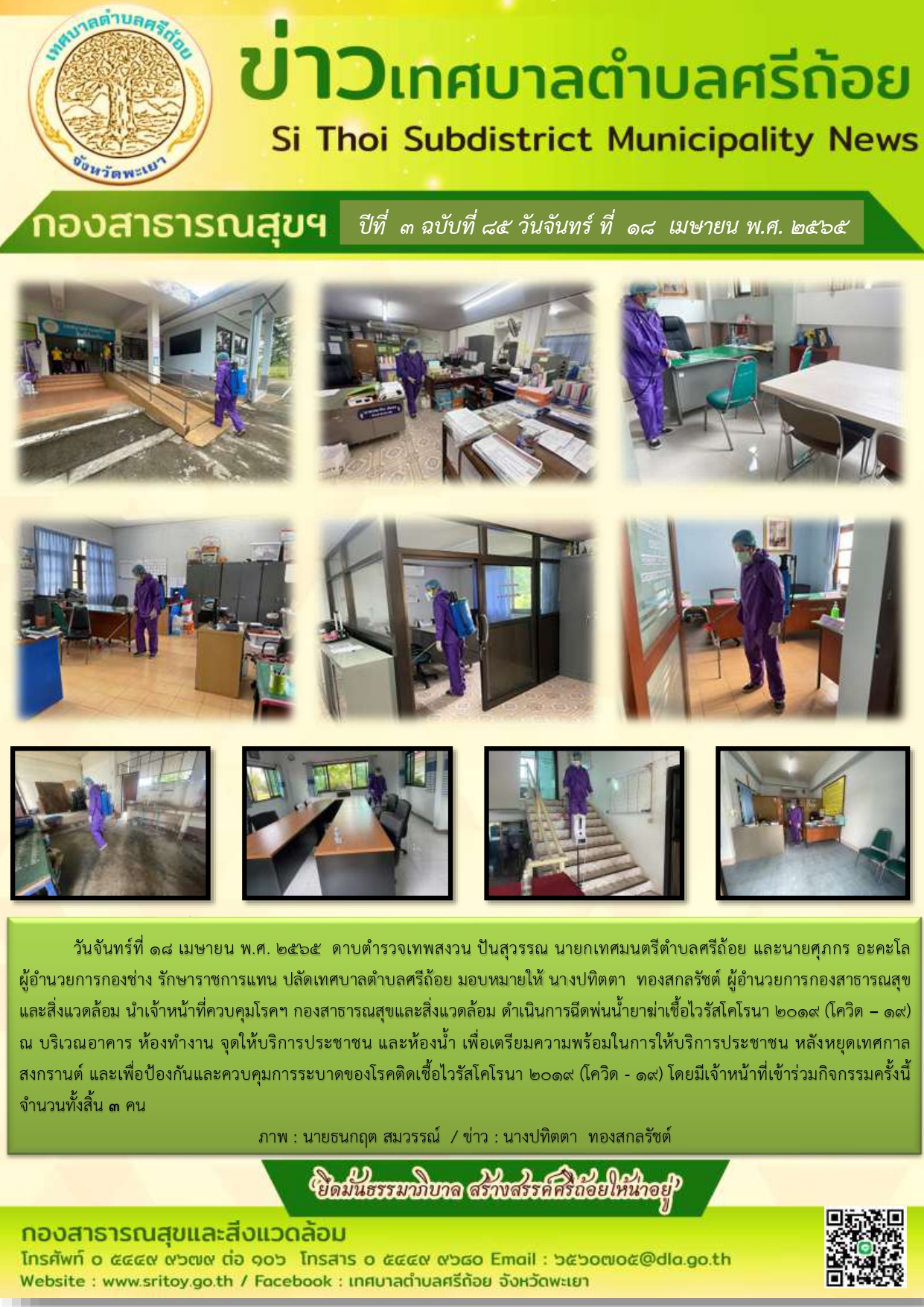 ดำเนินการฉีดพ่นน้ำยาฆ่าเชื้อไวรัสโคโรนา 2019 ณ บริเวณอาคาร ห้องทำงาน จุดให้บริการประชาชน และห้องน้ำ เพื่อเตรียมความพร้อมในการให้บริการประชาชน หลังหยุดเทศกาลสงกรานต์ และเพื่อป้องกันและควบคุมการระบาดของโรคติดเชื้อไวรัสโคโรนา 2019