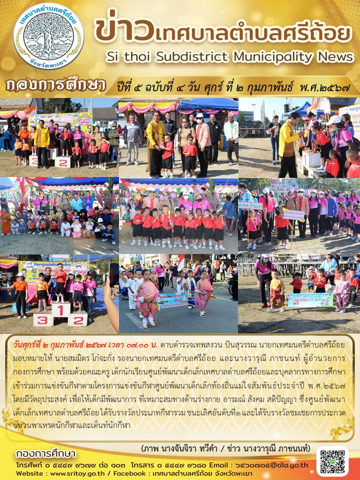ประชาสัมพันธ์ กองการศึกษา ปีที่ 5 ฉบับที่ 4 เข้าร่วมการแข่งกีฬาตามโครงการการแข่งกีฬาศูนย์พัฒนาเด็กเล็กท้องถิ่นแม่ใจสัมพันธ์ ประจำปี พ.ศ.2567
