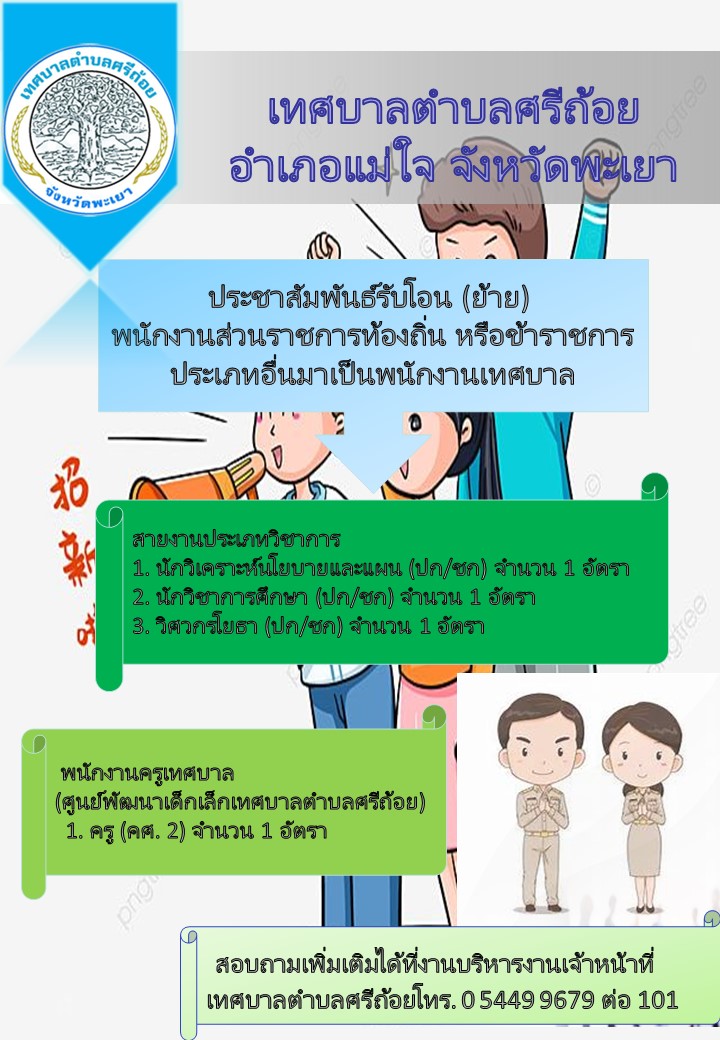 ด้วยเทศบาลตำบลศรีถ้อย อำเภอแม่ใจ จังหวัดพะเยา มีความประสงค์จะรับโอน (ย้าย) พนักงานเทศบาล เพื่อดำรงตำแหน่งตามแผนอัตรากำลัง 3 ปี (พ.ศ.2567 – 2569) โดยมีรายละเอียด ดังนี้