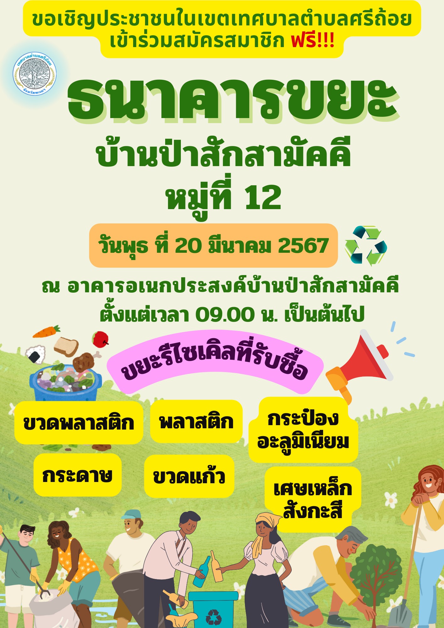 กองสาธารณสุข ประชาสัมพันธ์เชิญชวน ประชาชนในพื้นที่ตำบลศรีถ้อย เข้าร่วมกิจกรรม สาธิตการจัดตั้งธนาคารขยะ และเข้าร่วมเป็นสมาชิกธนาคารขยะบ้านป่าสักสามัคคี หมู่ที่ 12
