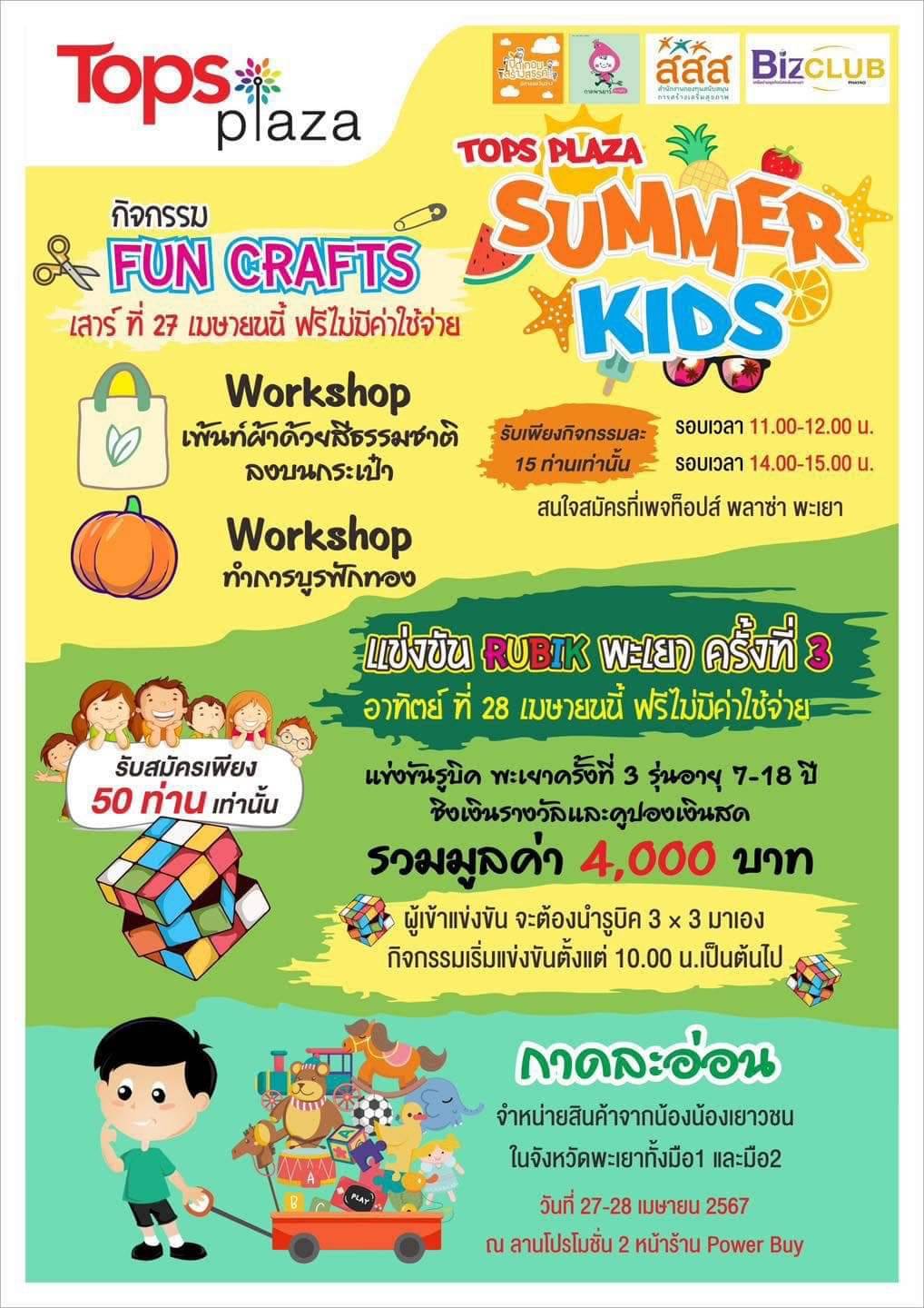 ไปร่วมกิจกรรมกันนะคะ " พาน้อง ๆ มาแข่งรูบิค และ ชวนครอบครัวมาทำกิจกรรมสนุก ๆ ด้วยกันค่ะ " + วันที่ 27 เมษายน สนุกกับกิจกรรม #เพ้นท์ผ้าด้วยสีธรรมชาติ >> สมัครที่เพจท็อปส์ พลาซ่าส์ พะเยา ทำ #การบูรฟักทอง >> สมัครที่เพจท็อปส์ พลาซ่าส์ พะเยา + วันที่ 28 เมษายน ????พบกับการแข่งขัน Rubik Phayao ครั้งที่ 3 รุ่นอายุระหว่าง 7-18 ปี ชิงเงินรางวัลและคูปองเงินสดรวมมูลค่า 4,000 บาท ( รับสมัครเพียง 50 ท่านเท่านั้น https://forms.gle/6rgxyj3eFSgMjnsh6 ) หมายเหตุ : สอบถามเพิ่มเติมที่เบอร์ 093- 2322899