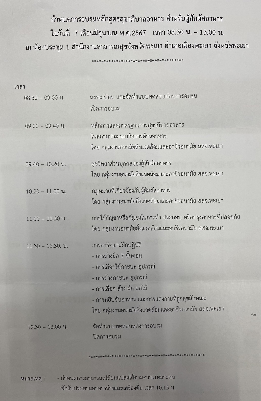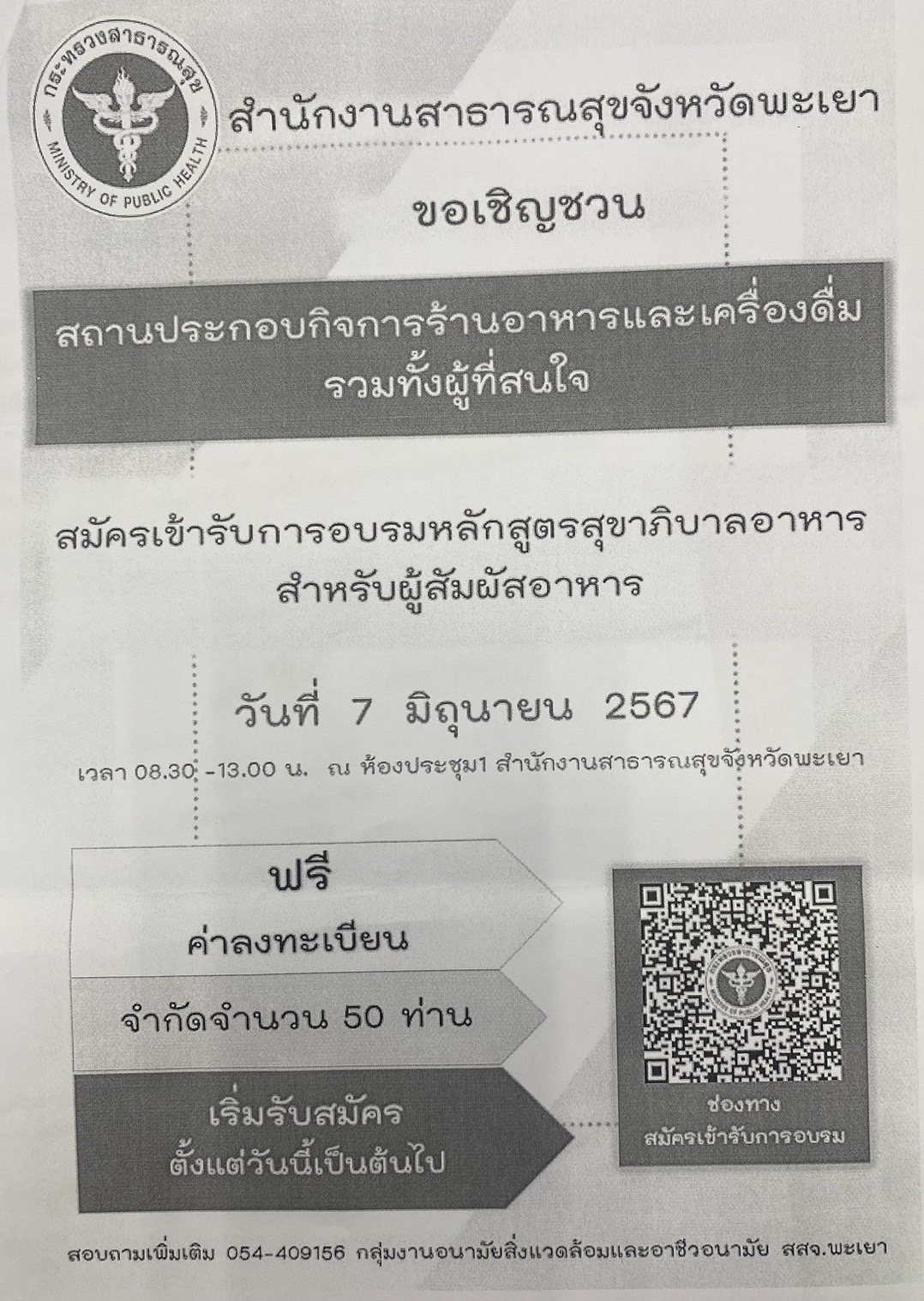 เชิญ ผู้ประกอบการ ที่เกี่่ยวข้องกับอาหารและเครื่องดื่ม อบรมหลักสูตรสุขาภิบาลอาหารสำหรับผู้สัมผัสอาหาร ในวันที่ 7 มิถุนายน2567 ณ ห้องประชุม 1 สำนักงานสาธารณสุขจังหวัดพะเยา (ฟรีค่าลงทะเบียน)