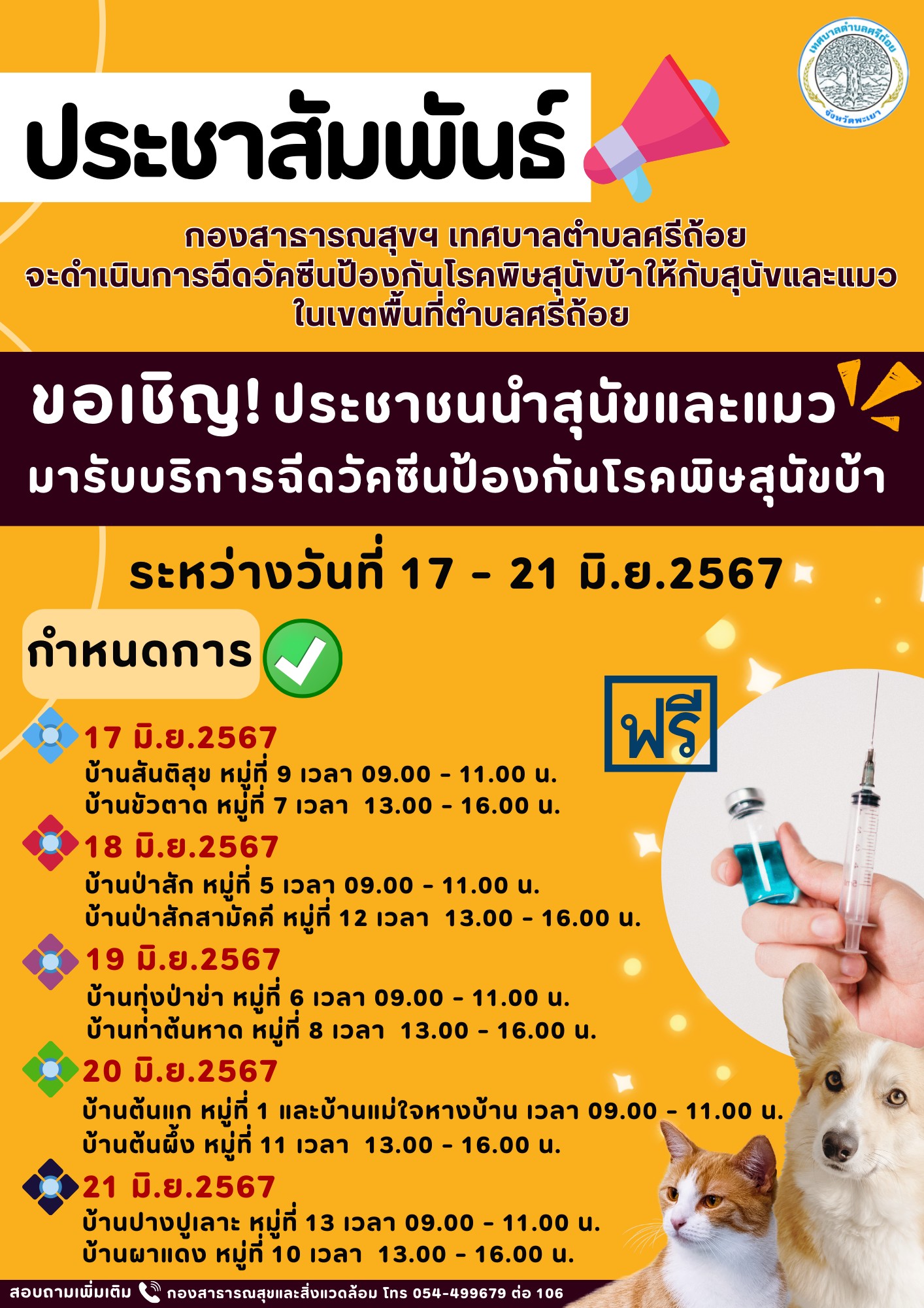ประชาสัมพันธ์ กองสาธารณสุขฯ เทศบาลตำบลศรีถ้อย จะดำเนินการฉีดวัคซีนป้องกันโรคพิษสุนัขบ้าให้กับสุนัขและแมวในเขตพื้นที่เทศบาลตำบลศรีถ้อย ระหว่างวันที่ 17 - 21 มิถุนายน พ.ศ.2567