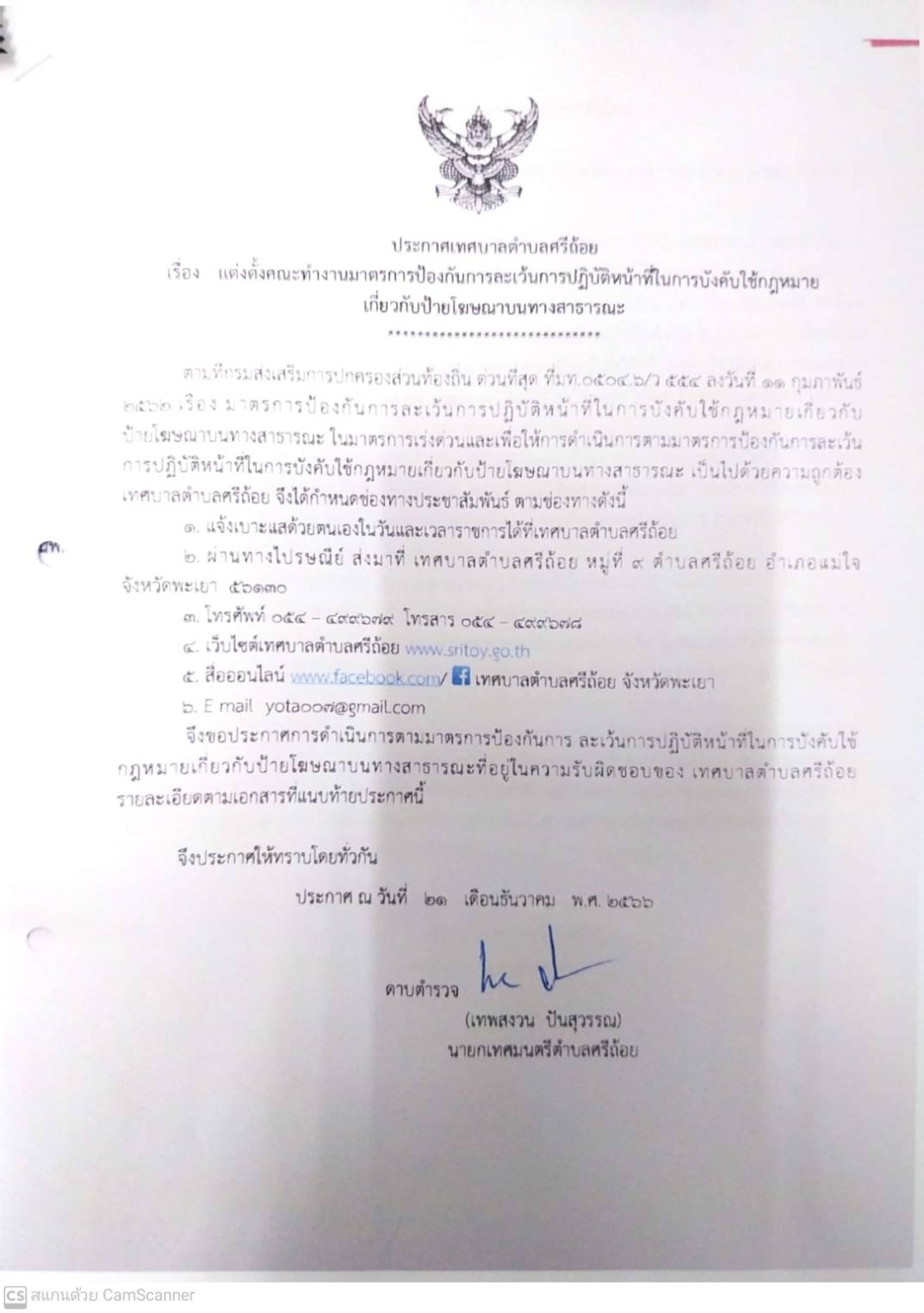 ประกาศ เรื่องแต่งตั้งคณะทำงานมาตรการป้องกันการละเว้นการปฏิบัติหน้าที่ในการบังคับใช้กฏหมายเกี่ยวกับป้ายโฆษณาบนทางสาธารณะ