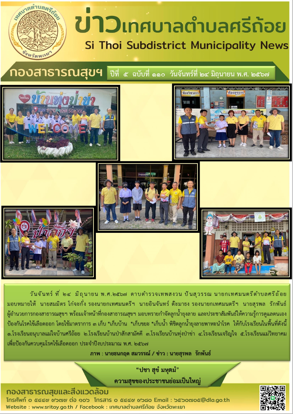 ประชาสัมพันธ์ กองสาธารณสุขฯ เทศบาลตำบลศรีถ้อย มอบทรายกำจัดลูกน้ำยุงลาย และประชาสัมพันธ์ให้ความรู้ดูแลตนเอง ป้องกันโรคไข้เลือดออก