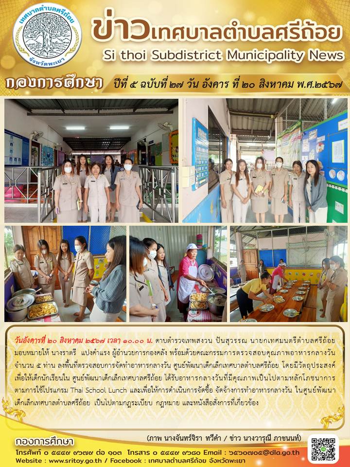 ประชาสัมพันธ์ กองการศึกษา ปีที่ 5 ฉบับที่ 27 ลงพื้นที่ตรวจสอบการจัดทำอาหารกลางวัน ศูนย์พัฒนาเด็กเล็กเทศบาลตำบลศรีถ้อย