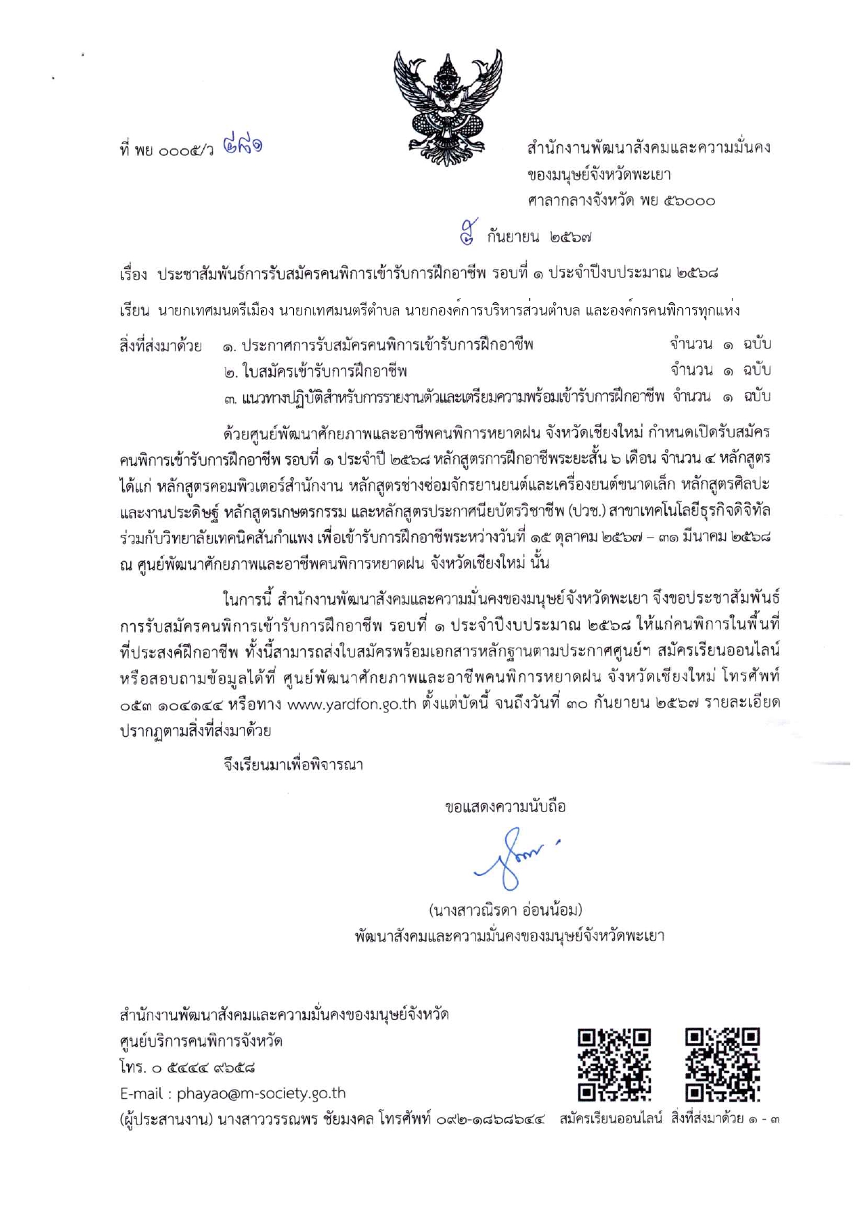 ???? ประชาสัมพันธ์การรับสมัครคนพิการเข้ารับการฝึกอาชีพ รอบที่ 1 ประจำปีงบประมาณ 2568 หลักสูตรการฝึกอาชีพระยะสั้น 6 เดือน จำนวน 4 หลักสูตร ให้แก่คนพิการในพื้นที่ที่ประสงค์ฝึกอาชีพ ทั้งนี้สามารถส่งใบสมัครพร้อมเอกสารหลักฐานตามประกาศศูนย์ฯ สมัครเรียนออนไลน์หรือสอบถามข้อมูลได้ที่ ศูนย์พัฒนาศักยภาพและอาชีพคนพิการหยาดฝน จังหวัดเชียงใหม่