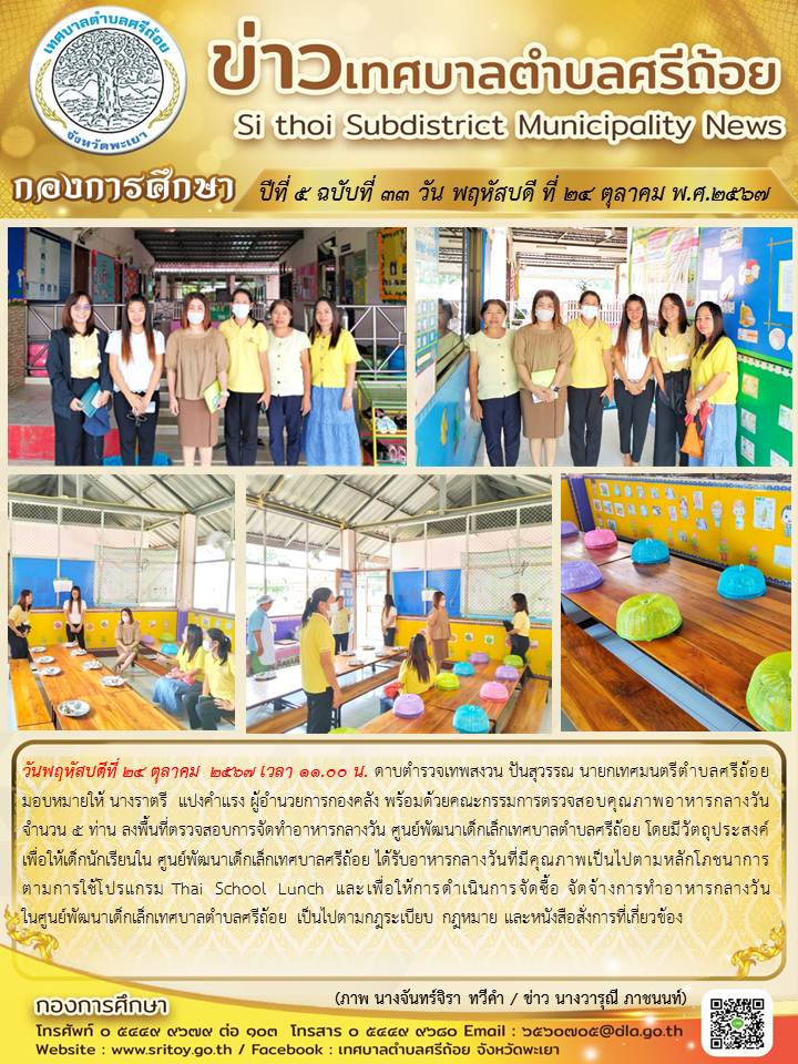 ประชาสัมพันธ์ กองการศึกษา ปีที่ 5 ฉบับที่ 33 ลงพื้นที่ตรวจสอบการจัดทำอาหารกลางวัน ศูนย์พัฒนาเด็กเล็กเทศบาลตำบลศรีถ้อย