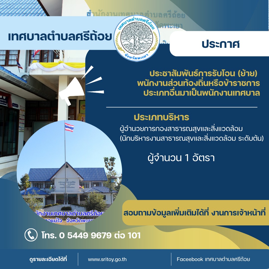 ประกาศเทศบาลตำบลศรีถ้อย เรื่อง รับโอน (ย้าย) พนักงานส่วนตำบลหรือพนักงานส่วนท้องถิ่นอื่น เพื่อให้มาดำรงตำแหน่งว่าง