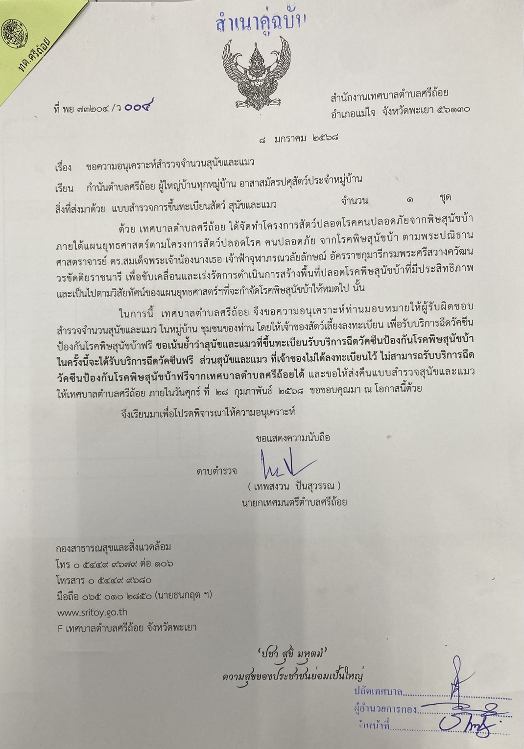ประกาศ ประชาสัมพันธ์ ผู้ที่เลี้ยงสุนัขและแมว ให้มาขึ้นทะเบียนรับบริการ ฉีดวัคซีนป้องกันโรคพิษสุนัขบ้า ประจำปี 2568 ได้ที่บ้านผู้ใหญ่บ้าน หรือผู้ที่ได้รับมอบหมาย ภายใน เดือนกุมภาพันธ์ 2568 เพื่อเทศบาลตำบลศรีถ้อย จะได้ ดำเนินการต่อไปฯ