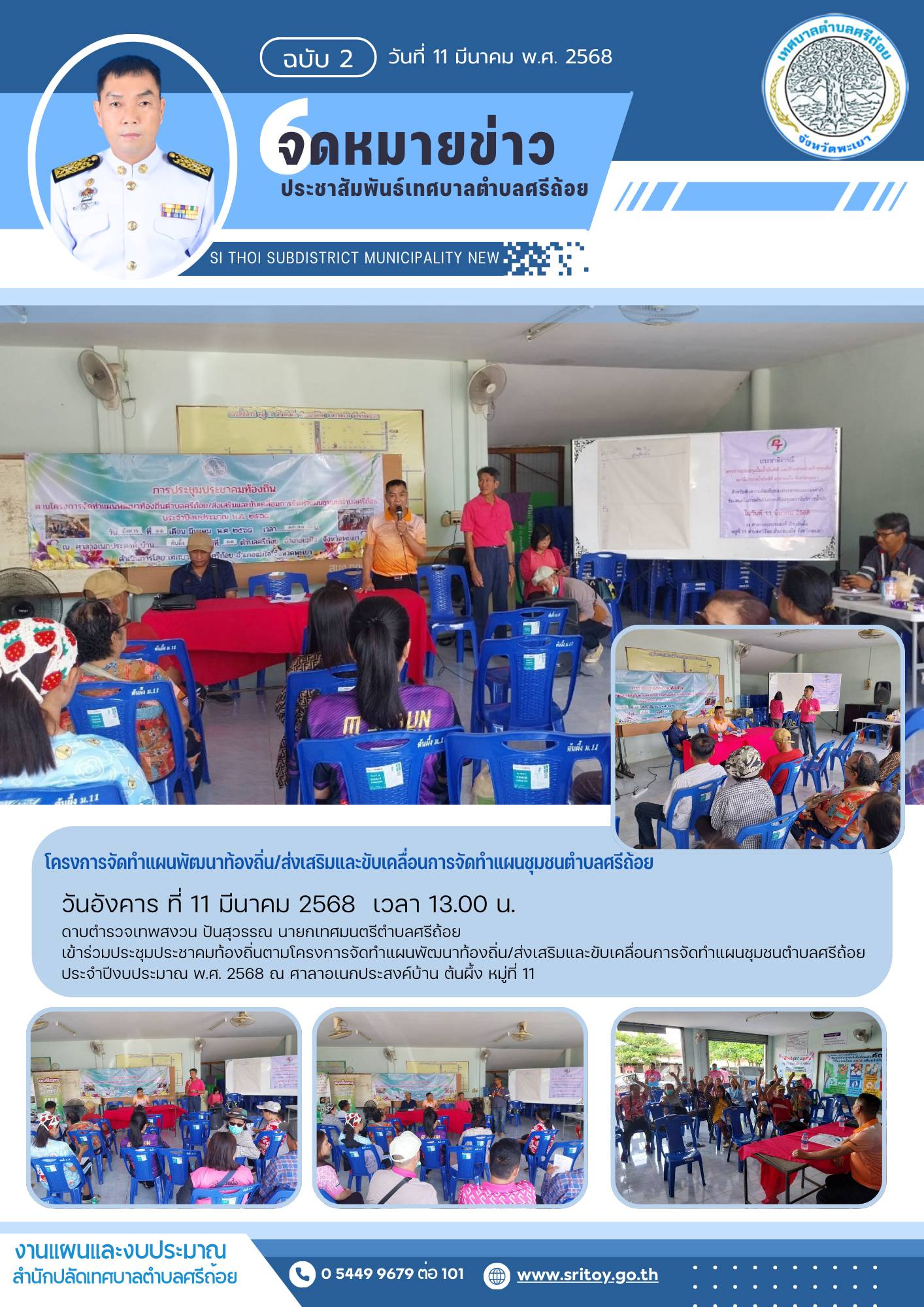 จดหมายข่าว ประชาสัมพันธ์เทศบาลตำบลศรีถ้อย โครงการจัดทำแผนพัฒนาท้องถิ่น/ส่งเสริมและขับเคลื่อนการจัดทำแผนชุมชนตำบลศรีถ้อย ณ ศาลาอเนกประสงค์บ้านต้นผึ้ง หมู่ที่ 11