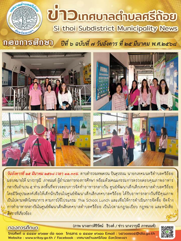 ประชาสัมพันธ์ กองการศึกษา ปีที่ 6 ฉบับที่ 7 ลงพื้นที่ตรวจสอบการจัดทำอาหารกลางวัน ศูนย์พัฒนาเด็กเล็กเทศบาลตำบลศรีถ้อย