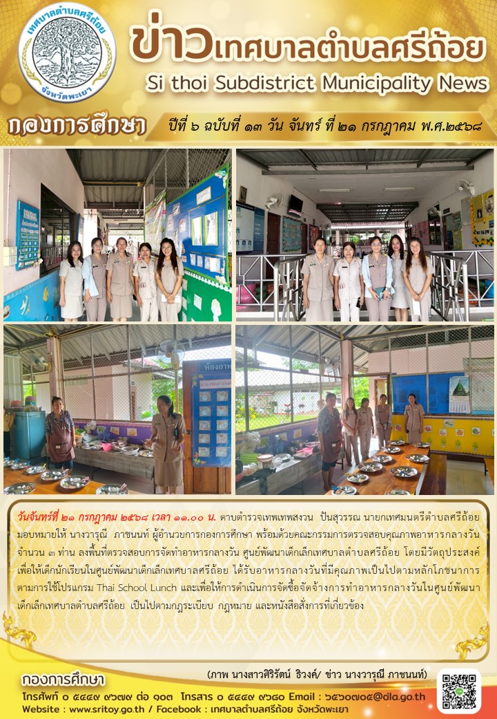ประชาสัมพันธ์ กองการศึกษา ปีที่ 6 ฉบับที่ 13 ลงพื้นที่ตรวจสอบการจัดทำอาหารกลางวัน ศูนย์พัฒนาเด็กเล็กเทศบาลตำบลศรีถ้อย