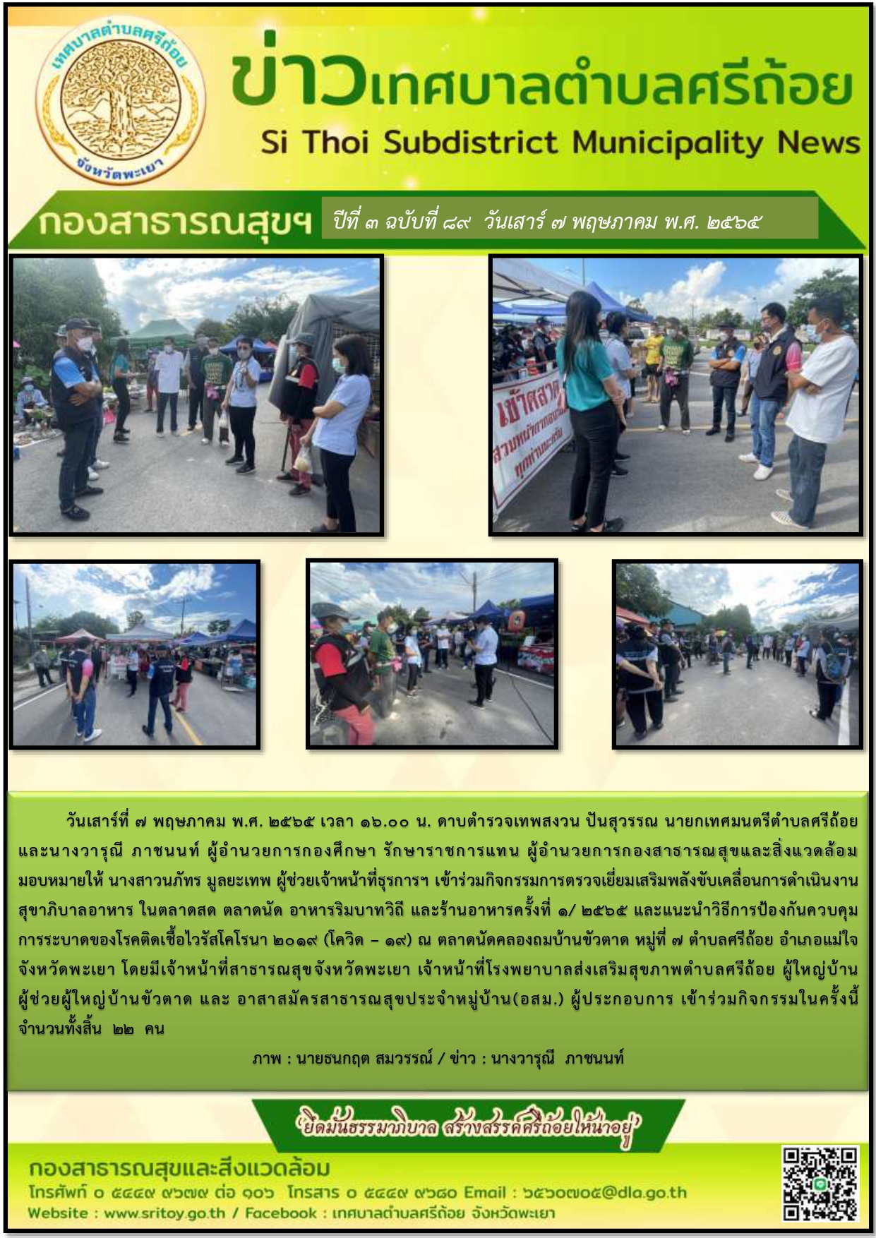 เข้าร่วมกิจกรรมการตรวจเยี่ยมเสริมพลังขับเคลื่อนการดำเนินงานสุขาภิบาลอาหาร ในตลาดสด ตลาดนัด อาหารริมบาทวิถี และร้านอาหารครั้งที่ 1/2565 และแนะนำวิธีการป้องกันควบคุมการระบาดของโรคติดเชื้อไวรัสโคโรนา 2019 ณ ตลาดนัดคลองถมบ้านขัวตาด หมู่ที่ 7 ตำบลศรีถ้อย
