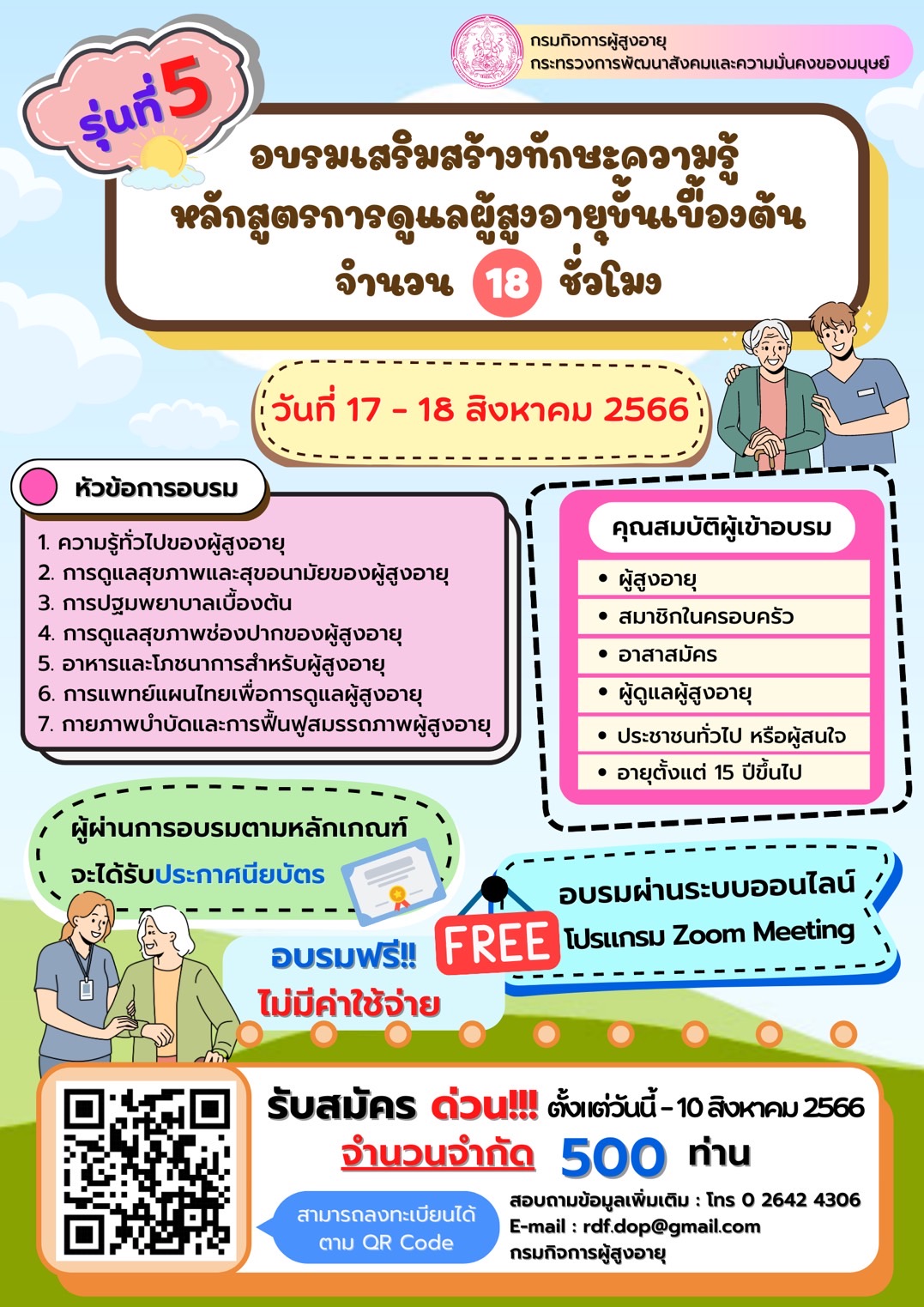 สมัครด่วน อบรมฟรี‼️ รุ่นสุดท้าย กรมกิจการผู้สูงอายุ จัดอบรม “หลักสูตรการดูแลผู้สูงอายุขั้นเบื้องต้น จำนวน 18 ชั่วโมง” รุ่นที่ 5 สำหรับผู้ดูแลผู้สูงอายุ อาสาสมัคร ประชาชนทั่วไป
